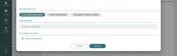 8-Choisissez ensuite le type de rendez-vous, précisez le motif de la consultation, et ajoutez éventuellement des documents (facultatifs mais conseillés). Cliquez sur "Suivant".