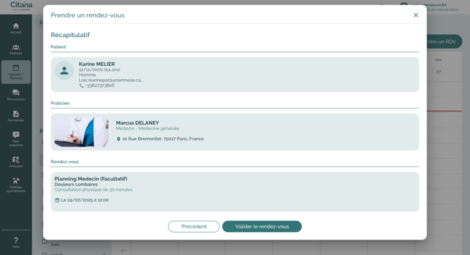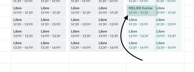 10- Une fois validé, le nom du patient apparaßtra directement sur le créneau réservé.