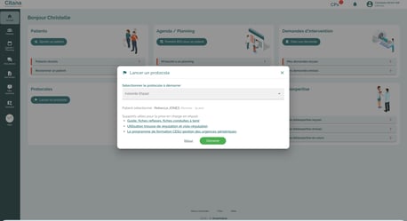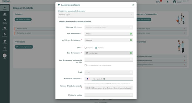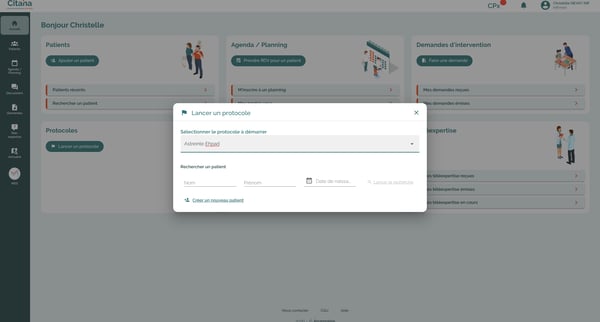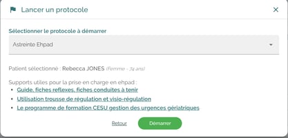 - A partir de la page d'accueil, cliquez sur "Lancer un protocole". Sélectionnez le protocole "Astreinte ehpad". Une pop-up s'ouvre vous invitant à rechercher le patient, ou à en créer un nouveau.