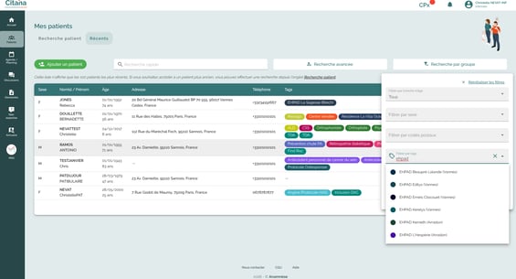 - Si besoin, cette liste est filtrable par ehpad, en cliquant sur "Recherche par groupe", puis filtrer par tag et sélectionner le nom de l'ehpad