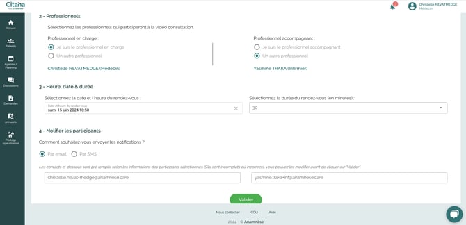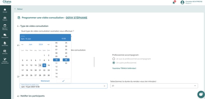 3. SĂ©lectionner lâheure, la date et la durĂ©e de la vidĂ©o consultation :